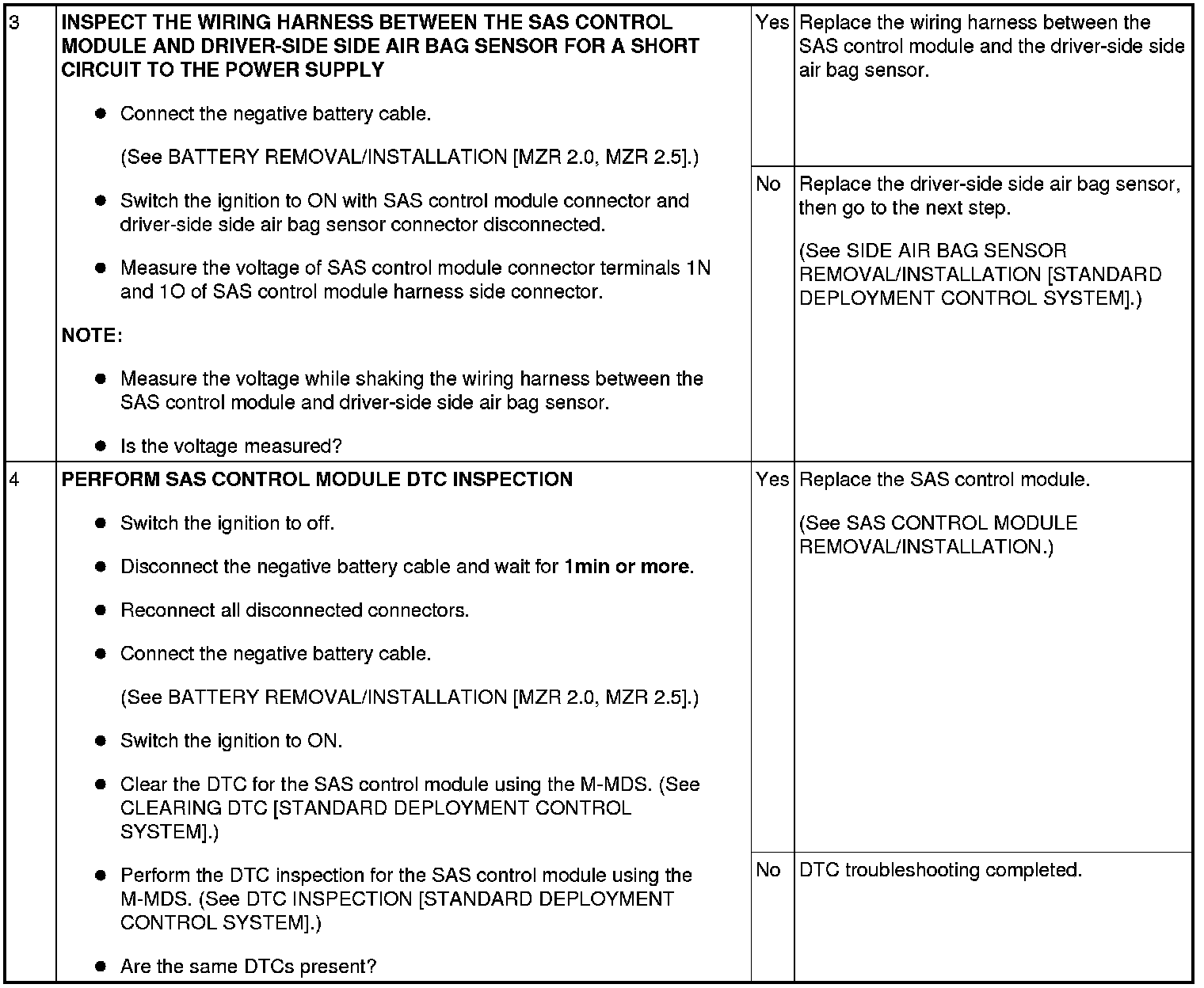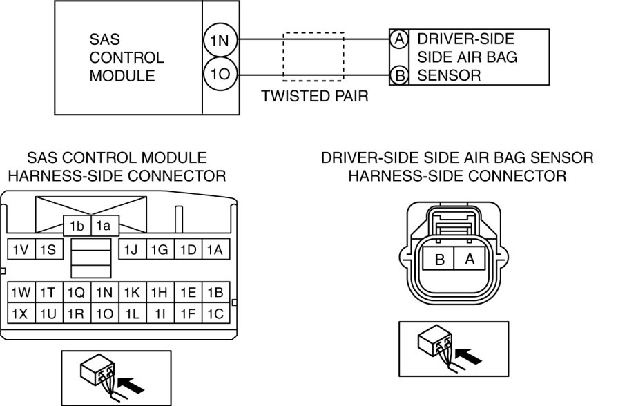 - Open or short circuit or short to ground or short to power supply in the wiring harness between the driver-side side air bag sensor and SAS control module