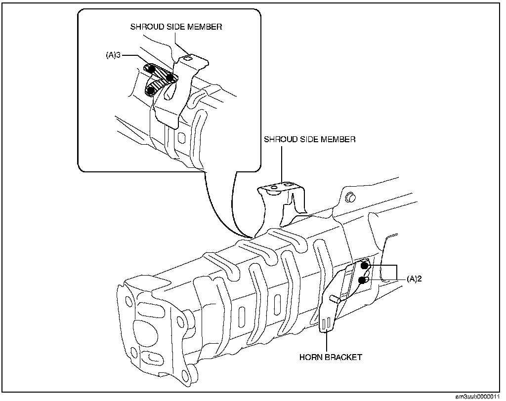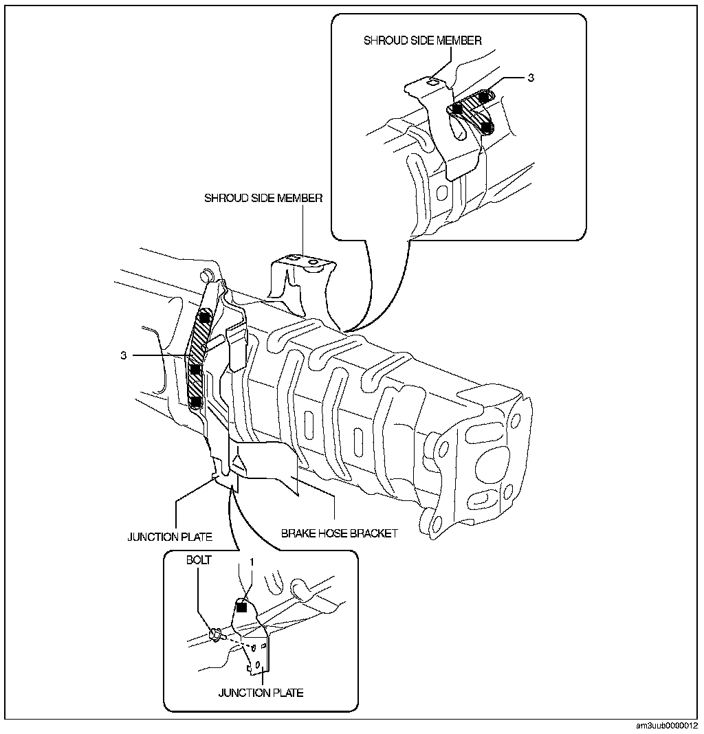 3. Remove the shroud side member, brake hose bracket and junction plate.