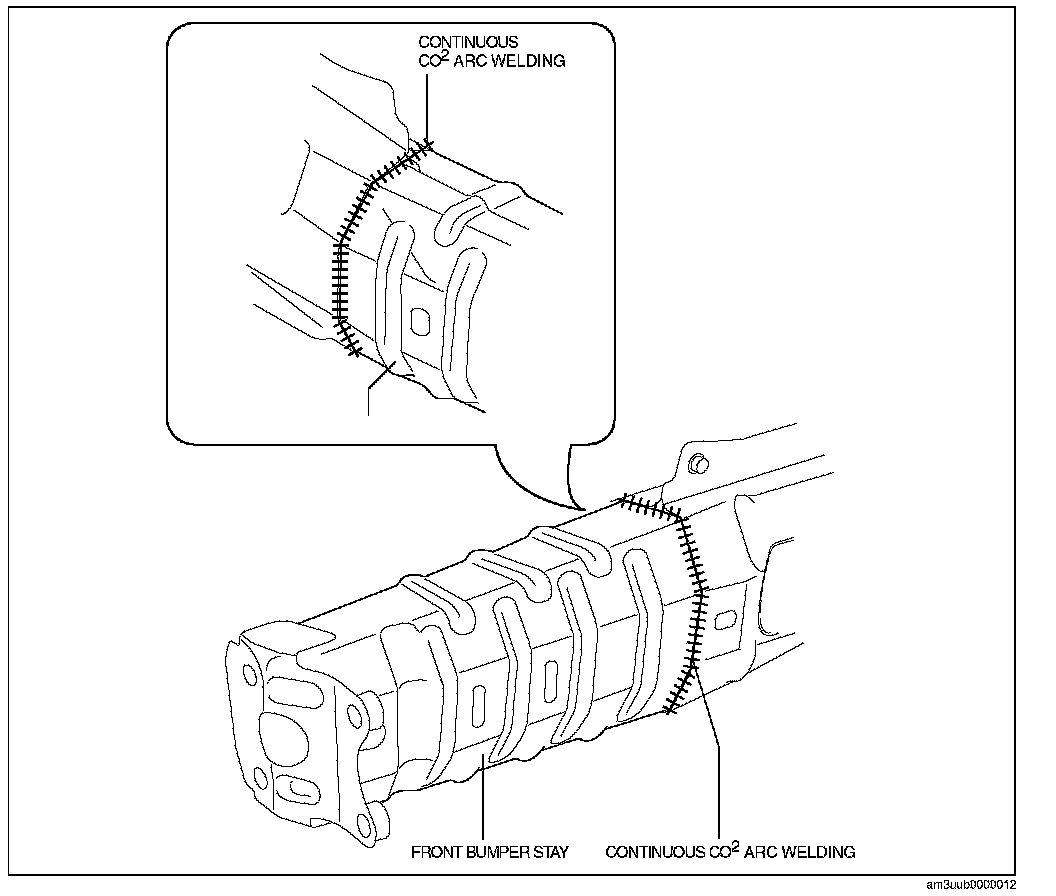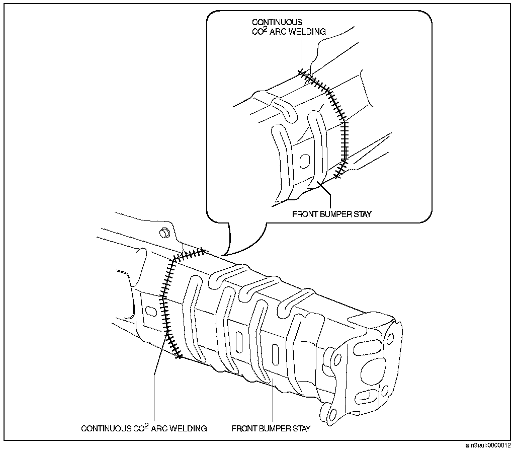 5. Continuous CO2 arc weld around the front side frame, and then install the front bumper stay.