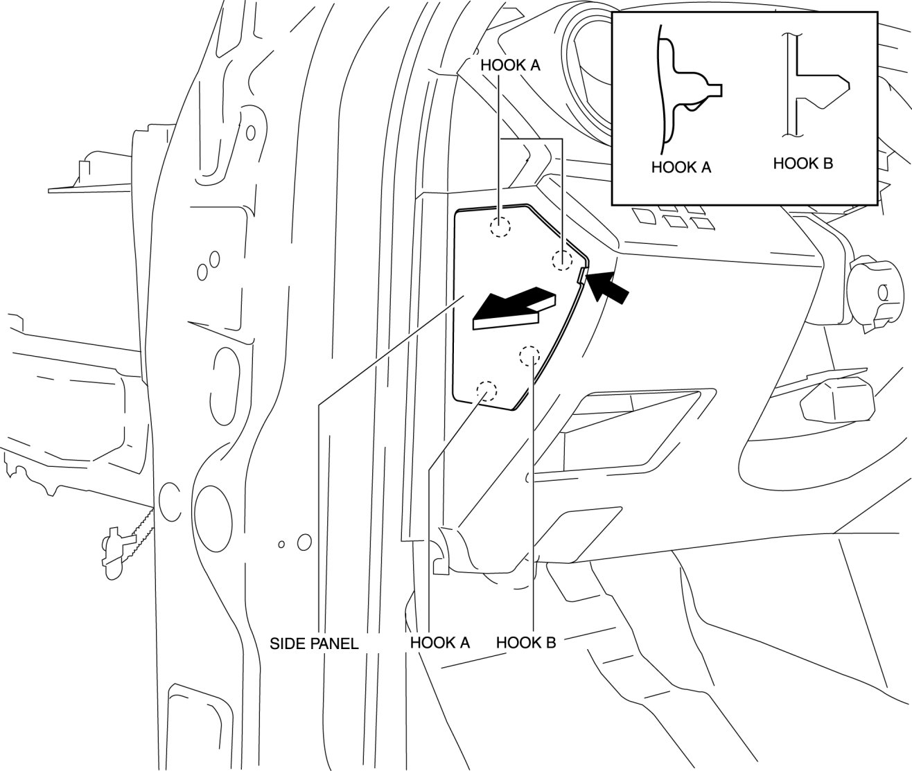 2. Pull the side panel in the direction of the arrow shown in the figure, then remove the clips and hook.