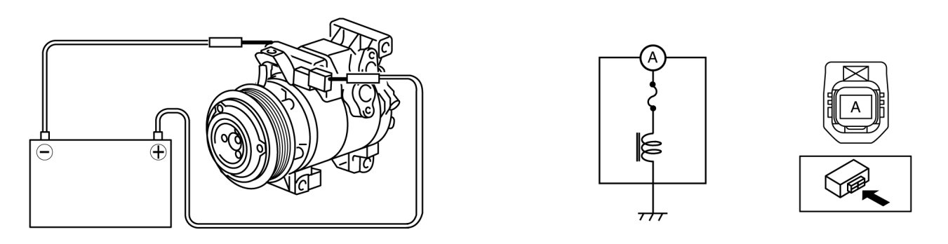 1. Connect battery to terminal A of magnetic clutch and ground to A/C compressor body.
