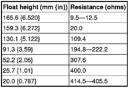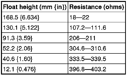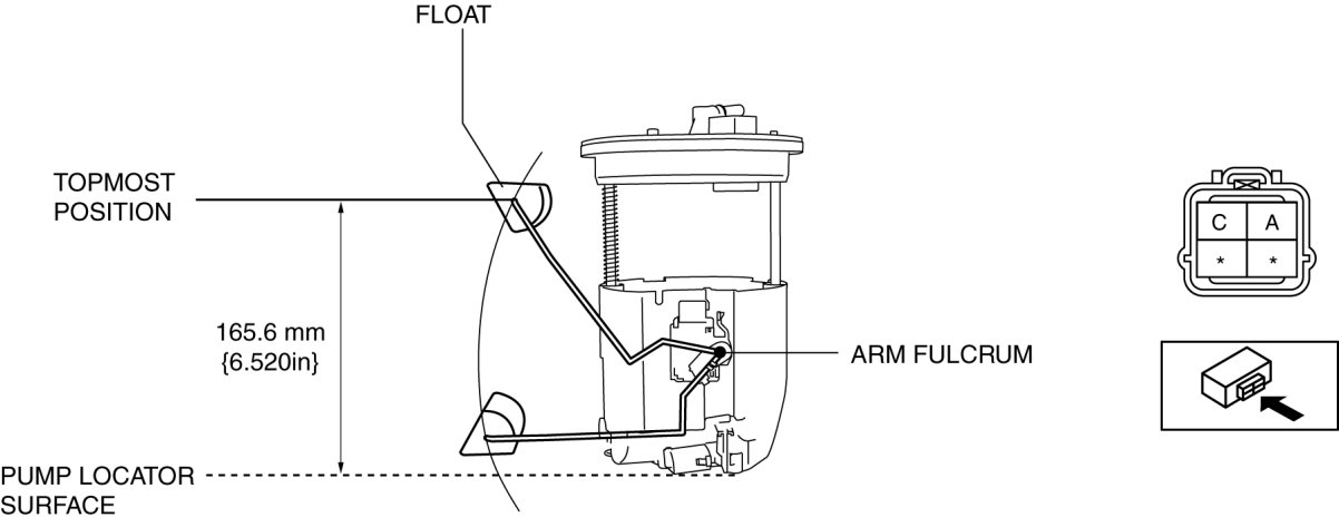 4. Verify that the resistance between terminals A and C of the fuel gauge sender unit based on the height of the float as shown in the figure.