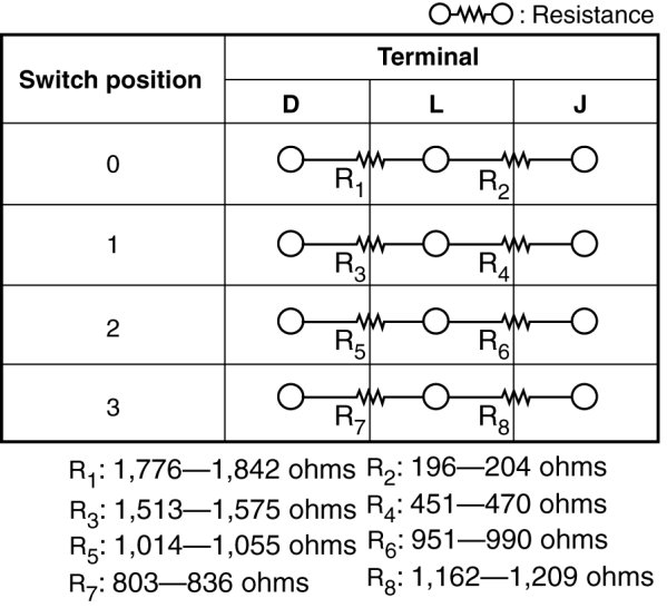 3. Verify that the resistance and continuity between the headlight leveling switch terminals is as indicated in the table.