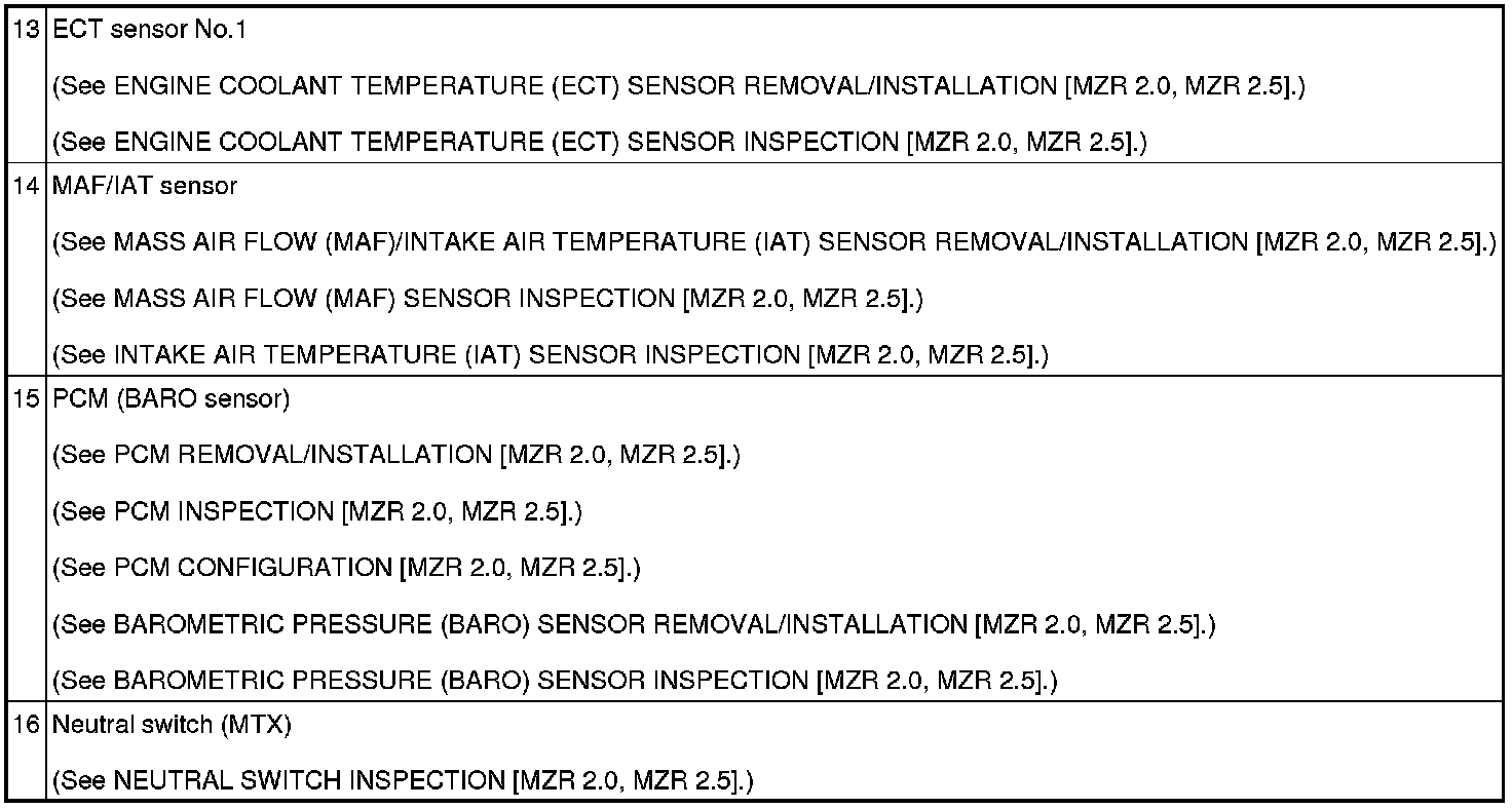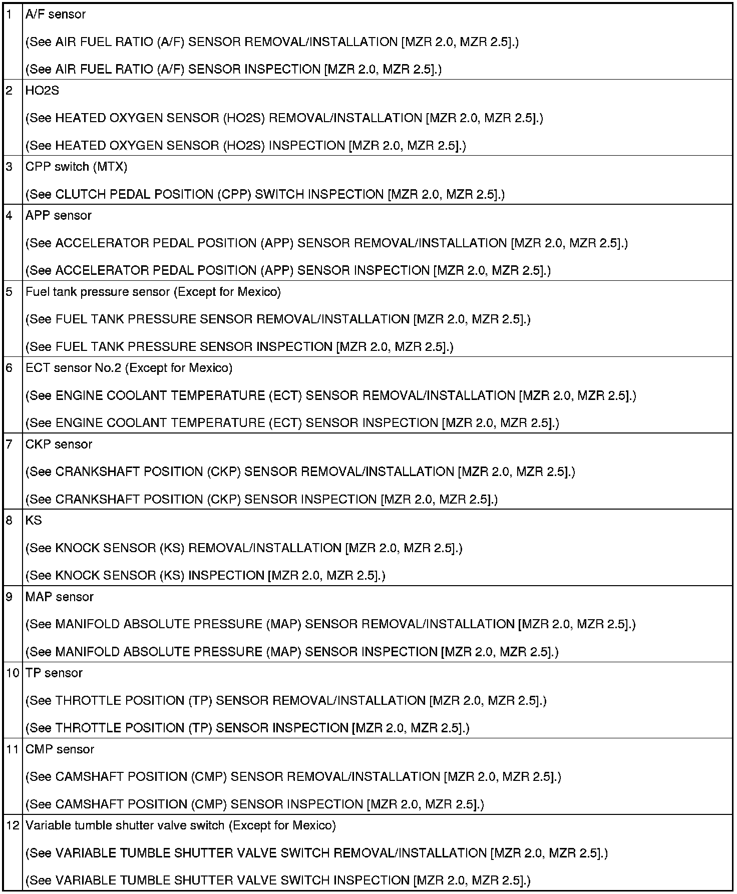CONTROL SYSTEM LOCATION INDEX [MZR 2.0, MZR 2.5]