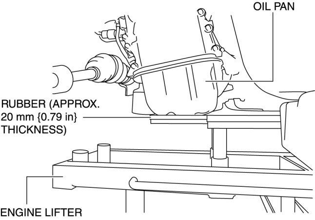 - When using an engine lifter, insert rubber of appropriate size (approx. 20 mm {0.79 in} thickness) between the engine lifter and the oil pan to support the oil pan.