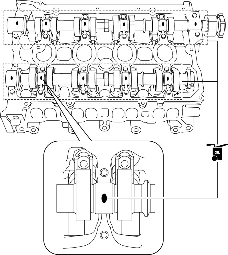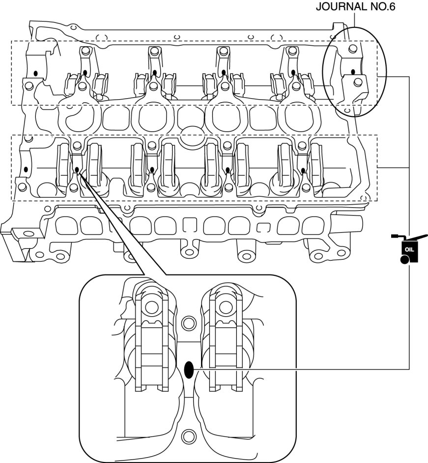 1. As shown in the figure, apply gear oil (SAE No. 90 or equivalent) or engine oil to the center area of each journal of the cylinder head.