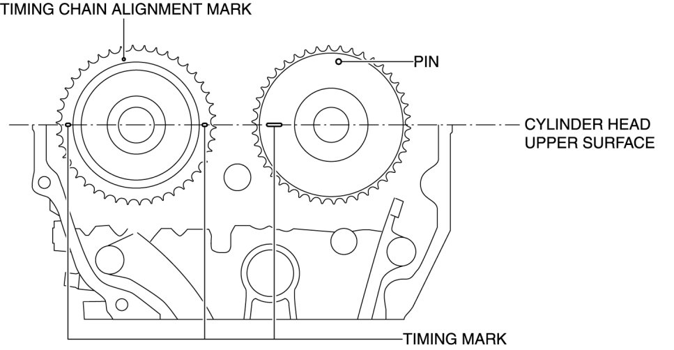 - If the camshaft is rotated with the timing chain removed and the piston at the top dead center position, the valve may contact the piston and the engine could be damaged. When rotating the camshaft with the timing chain removed, rotate it after lowering the piston from the top dead center position.