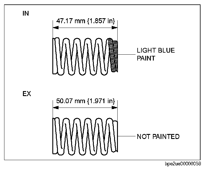 CAUTION: The valve springs differ depending on IN and EX sides. Therefore, verify the free length or identification paint beforehand and assemble the valve springs correctly.