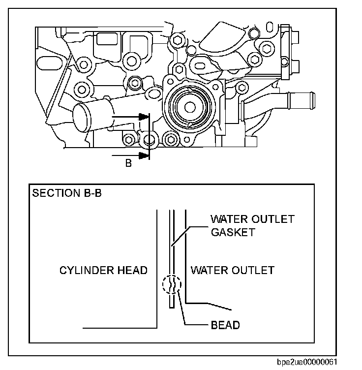 1. Install the water outlet gasket with the bead of gasket facing the direction shown in the figure.