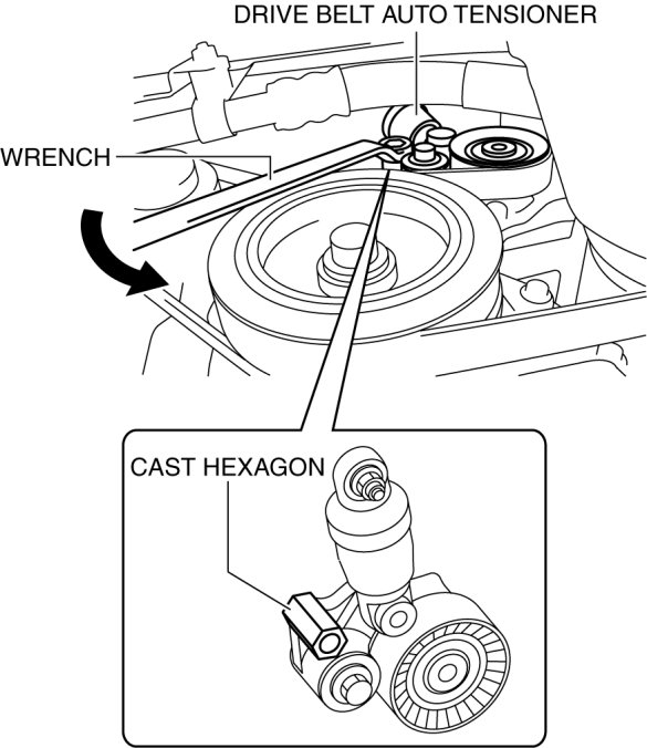 2. Insert a wrench onto the cast hexagon on the drive belt auto tensioner and release the tension by slowly turning in the direction shown in the figure.