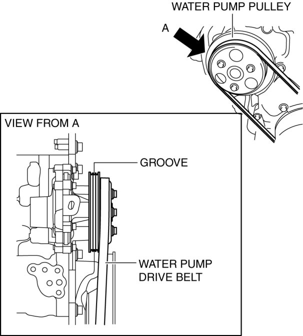 1. Set one side of the water pump drive belt into the groove of the crankshaft pulley.