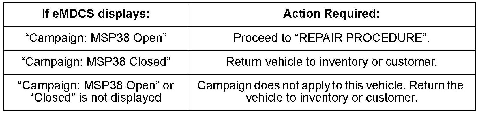 ^ BEFORE PERFORMING ANY REPAIR, VALIDATE THAT THE VEHICLE IS APPLICABLE TO THIS PROGRAM BY PERFORMING AN "eMDCS WARRANTY VEHICLE INQUIRY" AND VERIFYING THE VEHICLE DISPLAYS CAMPAIGN M5P38" AND ITS CAMPAIGN STATUS DISPLAYS "OPEN". SEE "VEHICLE INSPECTION PROCEDURE" BELOW.