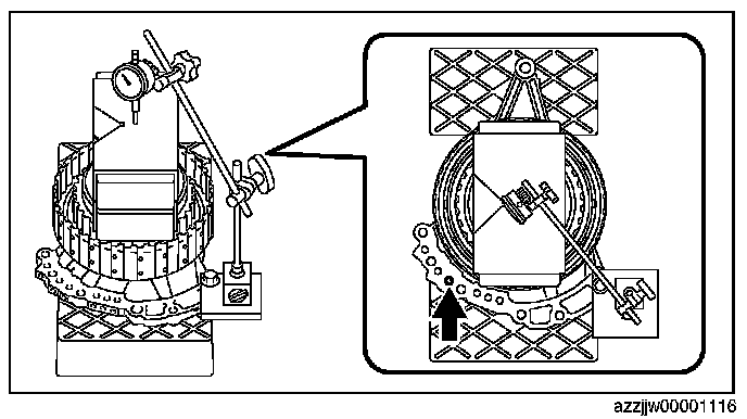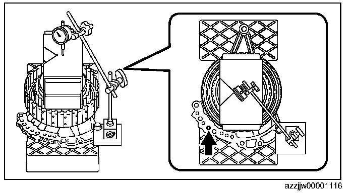 CAUTION: To reduce error during the high clutch clearance measurement, set the dial gauge so that it is perpendicular to the alignment surface of the oil pump with the transaxle case.