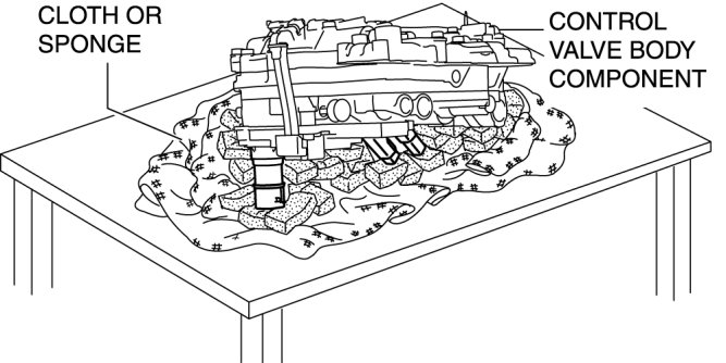 - Do not place the control valve body connector pointed downward as the control valve body connector part and sensor could be damaged. If the servicing can only be performed by pointing the control valve body connector downward, spread a large quantity of cloth or sponges on a table and place the control valve body connector part and sensor on the table so that they do not directly contact the table.