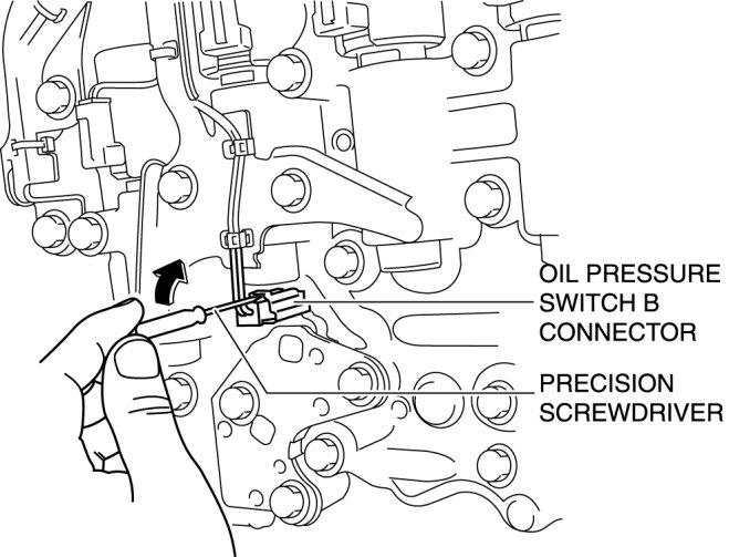 9. Insert a precision screwdriver and move it in the direction of the arrow to disconnect the oil pressure switch B connector as shown in the figure.