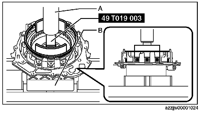 CAUTION: If the SST is pressed excessively by the press, surrounding parts could be damaged. Stop pressing down the SST using the press when the snap ring groove of the end cover comes out.