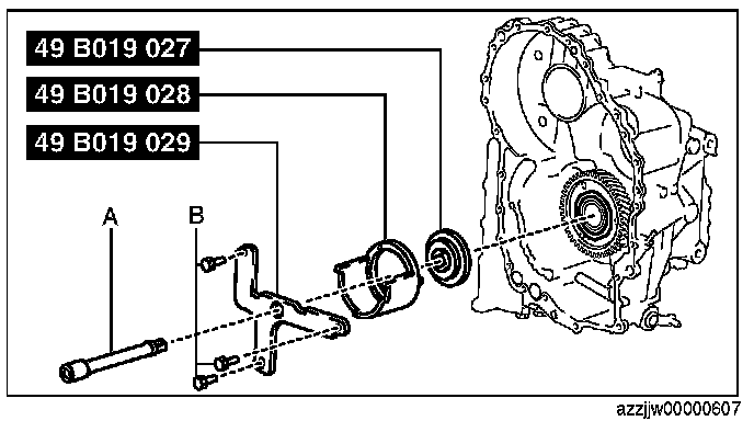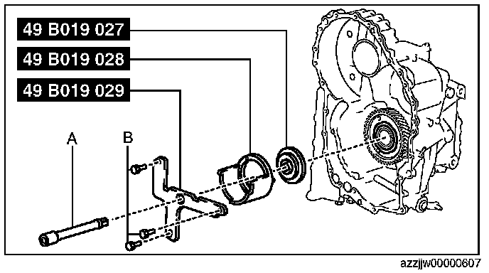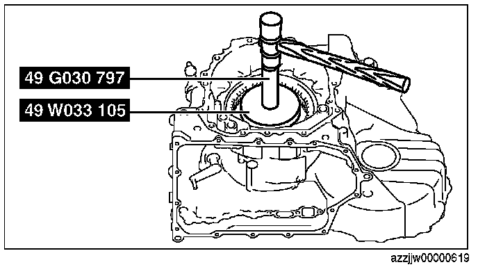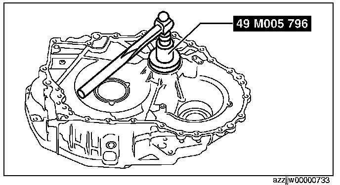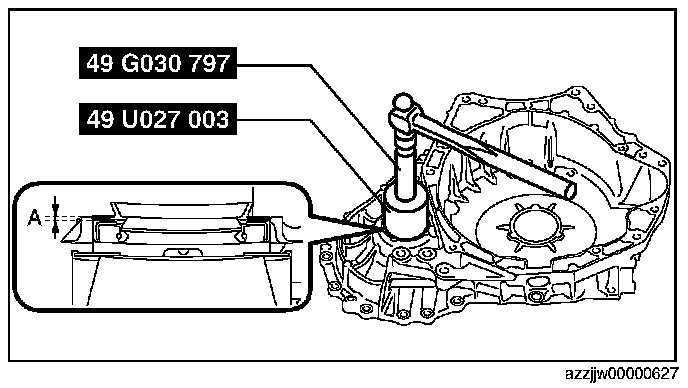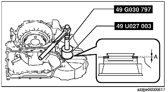 CAUTION: If the SST (49 G019 029) is tightened with excessive force, surrounding parts could be damaged. Stop tightening the SST when the snap ring groove of the transaxle case comes out.