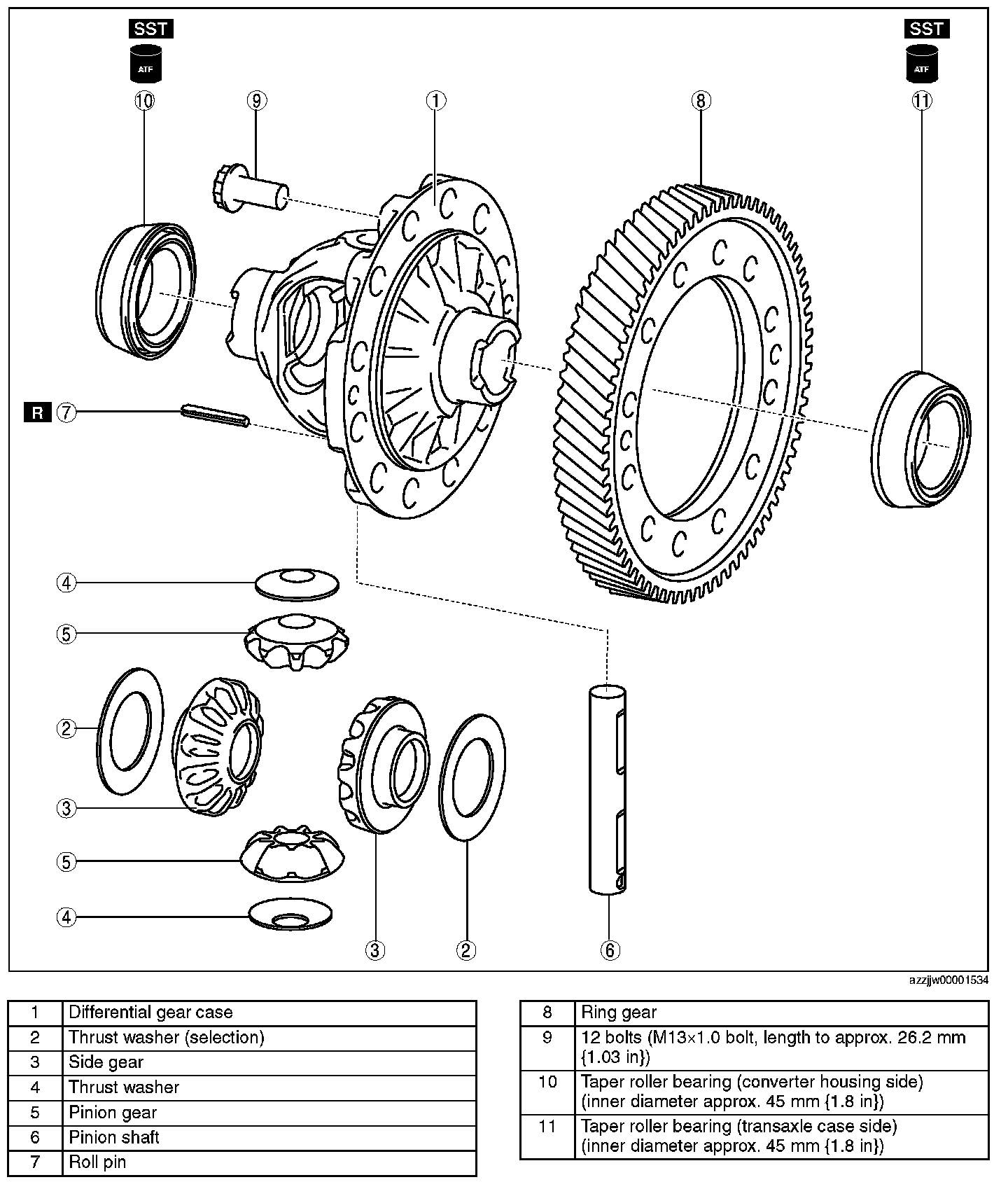 NOTE: Taper roller bearing size: Inner diameter approx. 45 mm {1.8 in}