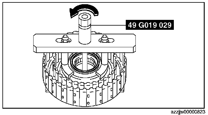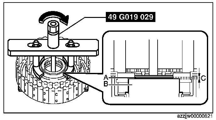 CAUTION: If the SST (49 G019 029) is tightened with excessive force, surrounding parts could be damaged. Stop tightening if a gap appears between the snap ring and seal plate.