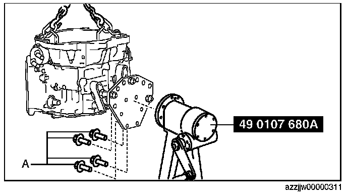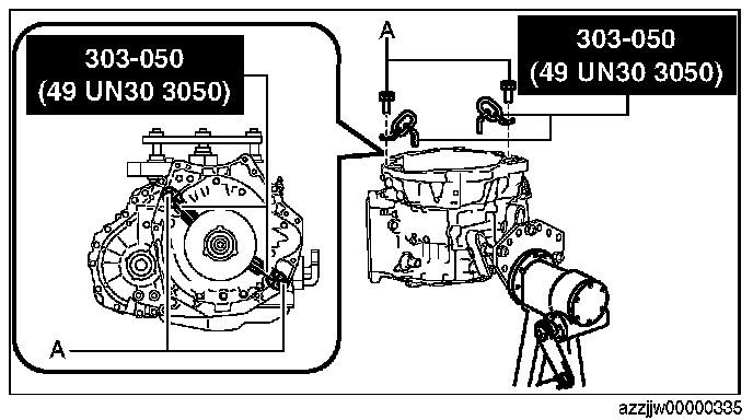 CAUTION: When removing the transaxle from the SST (engine stand) using chain hoists, be careful not to allow the transaxle (oil cooler in particular) to contact the SST (engine stand). If the transaxle contacts the SST, check the areas that made contact and replace damaged parts with new ones.