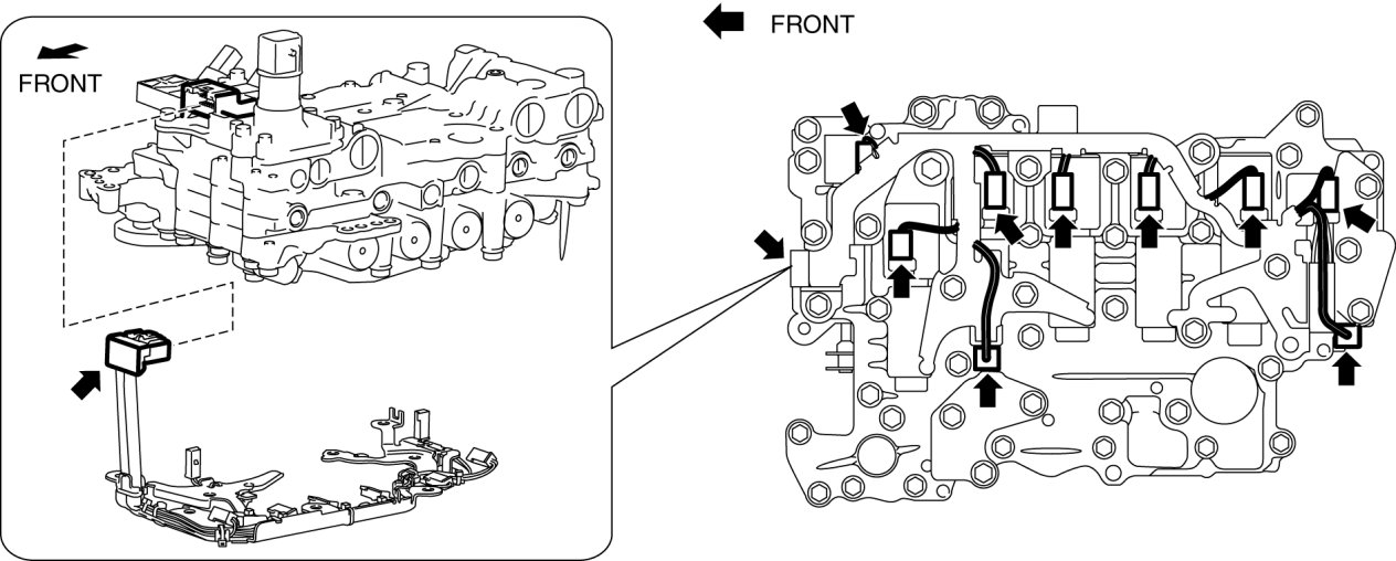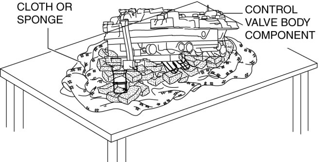 - Do not place the control valve body connector pointed downward as the control valve body connector part and sensor could be damaged. If the servicing can only be performed by pointing the control valve body connector downward, spread a large quantity of cloth or sponges on a table and place the control valve body connector part and sensor on the table so that they do not directly contact the table.