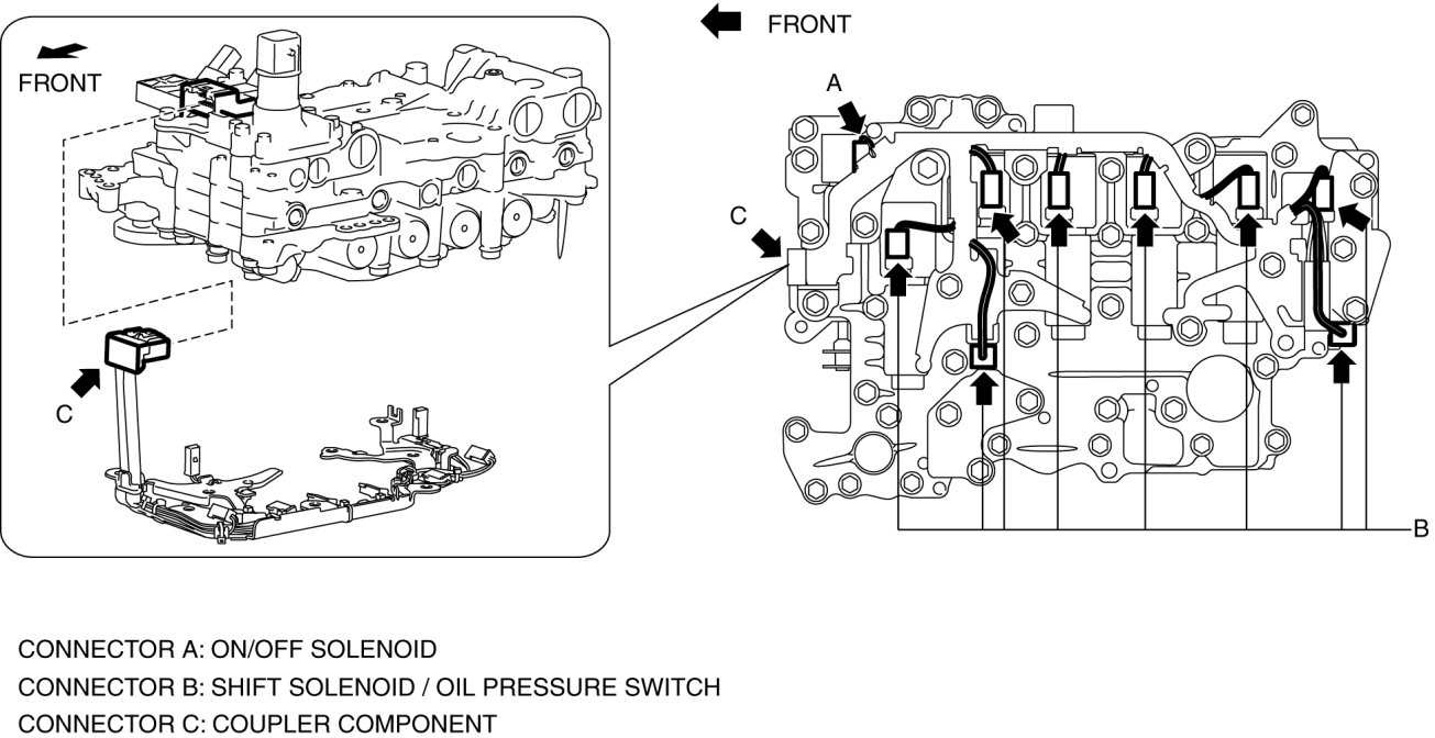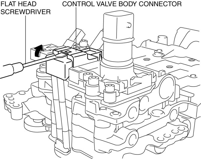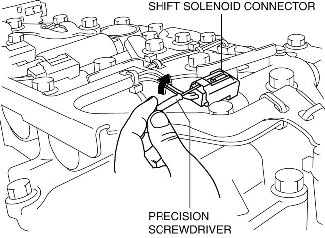 - Do not scratch the shift solenoid, shift solenoid connector, oil pressure switch, and oil pressure switch connector with the precision screwdriver or screwdriver.