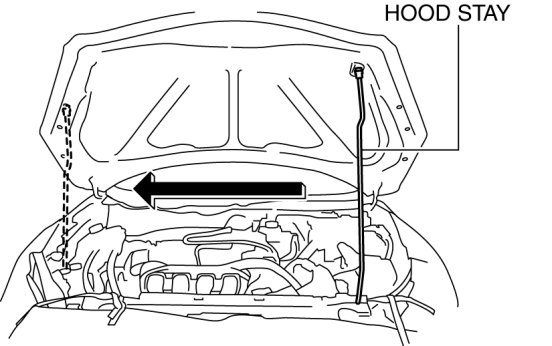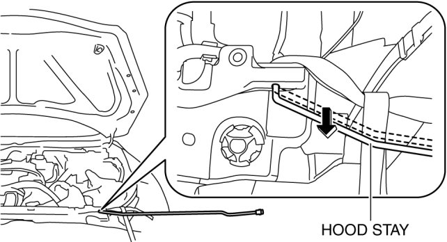 - If the hood stay is not hooked to the hood hole, the hood may fall down. Lightly shake the hood to verify that the hood stay is hooked securely.