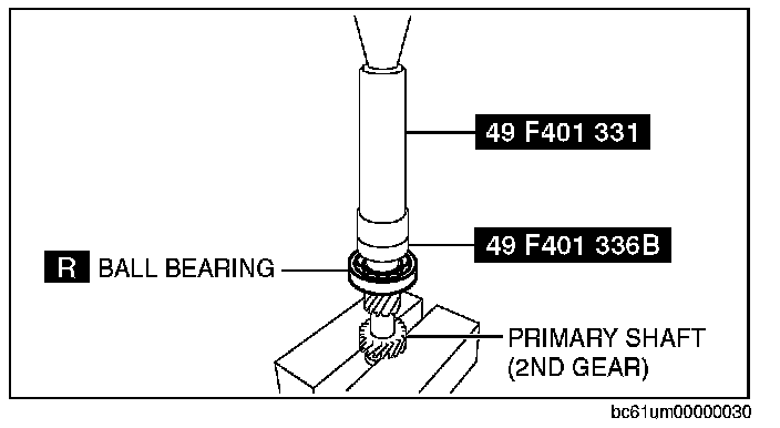 1. Set the primary shaft and new ball bearing, and the SSTs in a press as shown in the figure.