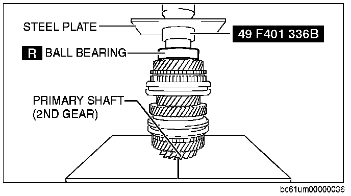 1. Set the primary shaft component, new ball bearing, SST, and an appropriate steel plate in a press as shown in the figure.