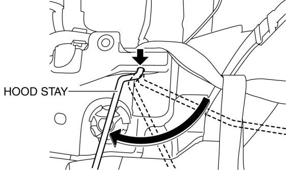 iv. Rotate the hood stay at the pivot fulcrum shown in the figure.