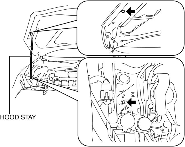 - The hood opening angle is increased by placing the hood stay to the position shown in the figure. A space for installing the SST can be secured by increasing the hood opening angle.