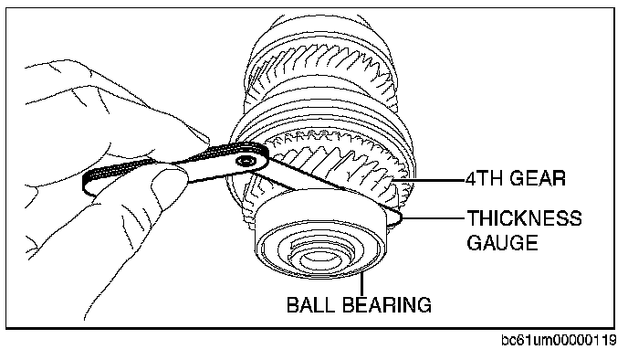 1. Insert a thickness gauge into the clearance between the 4th gear and the ball bearing.