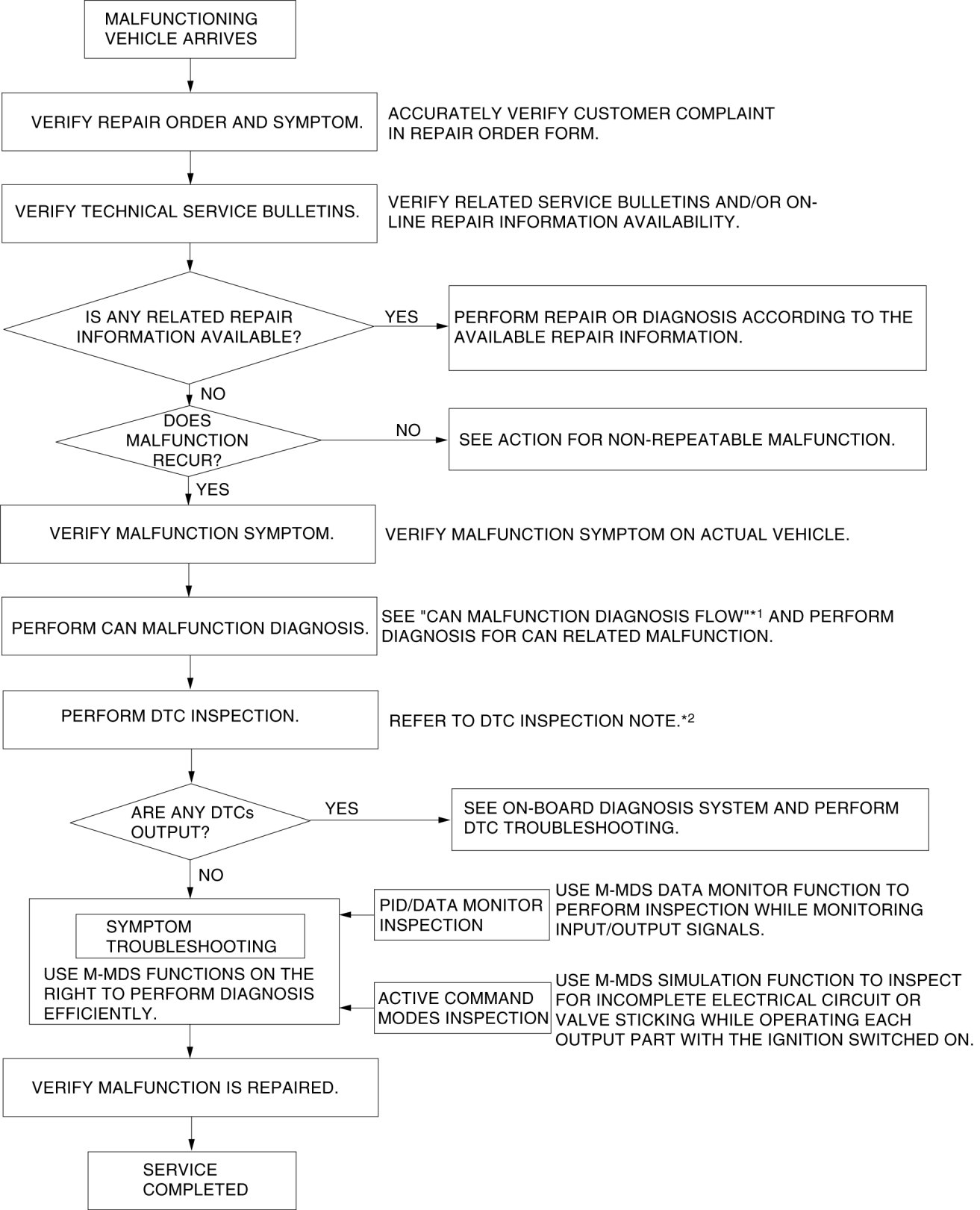 - If there is any vehicle malfunction complaint lodged by a customer, perform malfunction diagnosis according to the troubleshooting procedure.