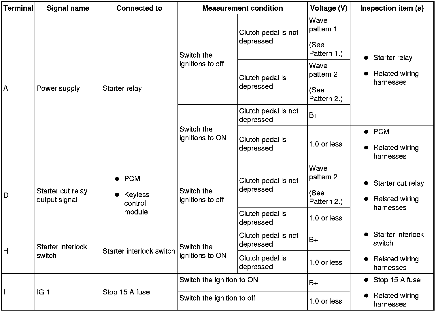 - If the voltage or continuity is not as specified in the terminal voltage table, inspect the parts under "Inspection item (s)".