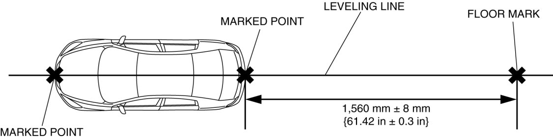 7. Position the leveling line over the marked positions at the front and rear of the vehicle, and then mark the position on the floor surface 1,560 mm ± 8 mm {61.42 in ± 0.3 in} from the vehicle rear.