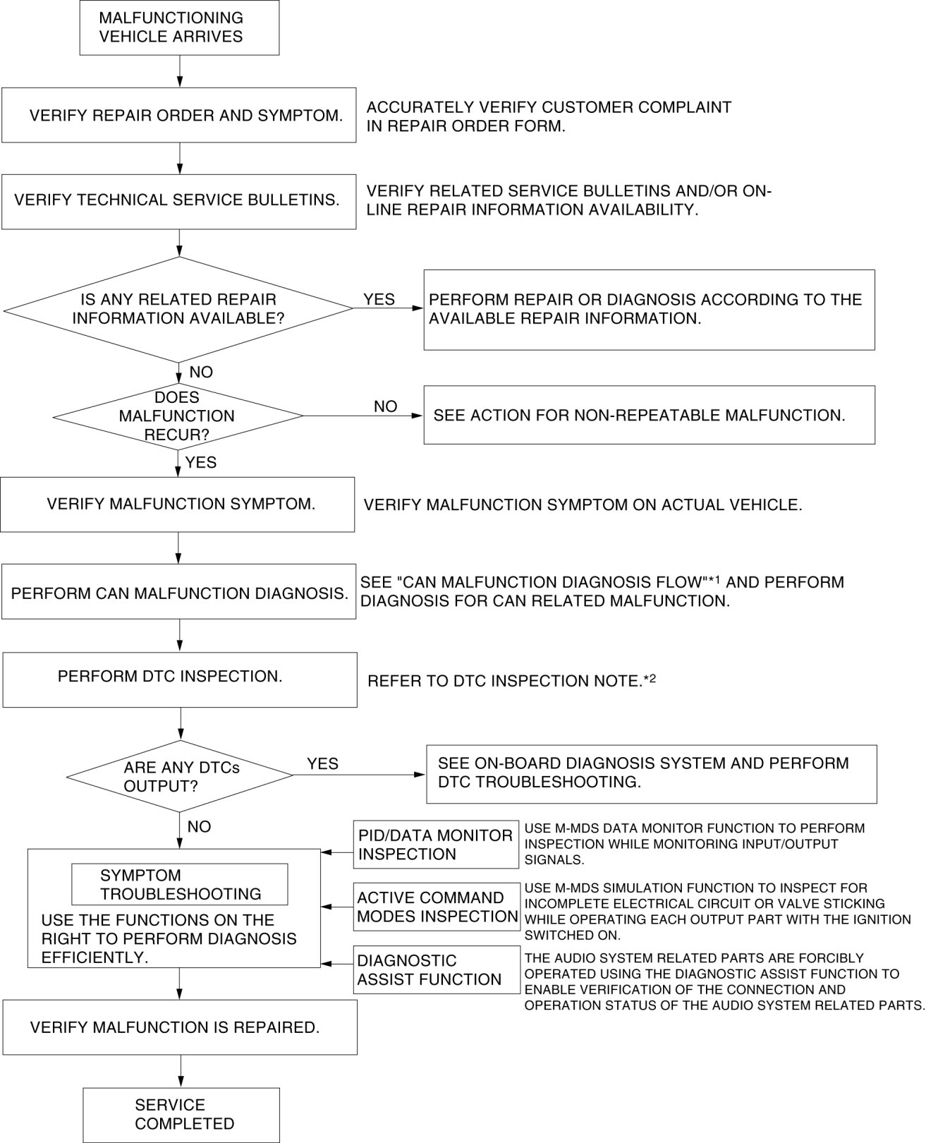 - If there is any vehicle malfunction complaint lodged by a customer, perform malfunction diagnosis according to the troubleshooting procedure.
