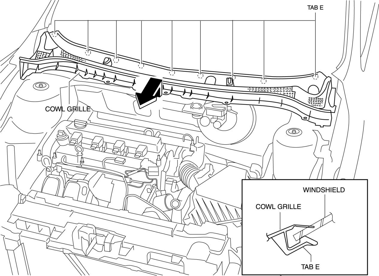 6. Pull the cowl grille in the direction of arrow, then remove the tabs E from the windshield.