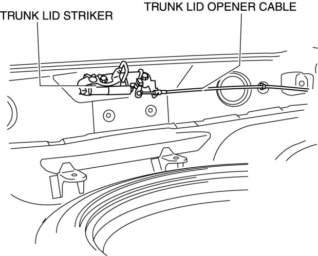 5. Disconnect the trunk lid striker from the trunk lid opener cable.