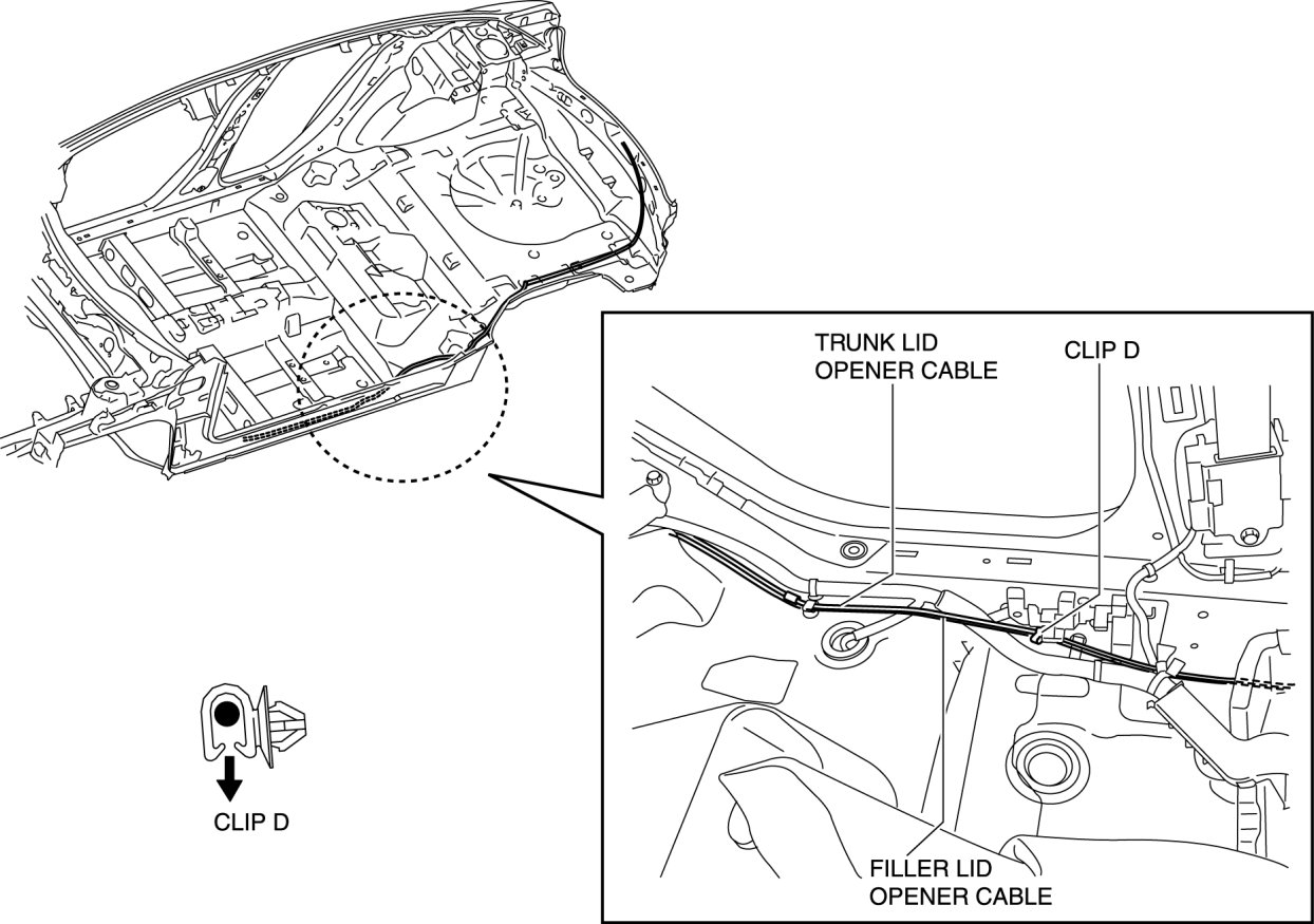 8. Remove the trunk lid opener cable from clips D.