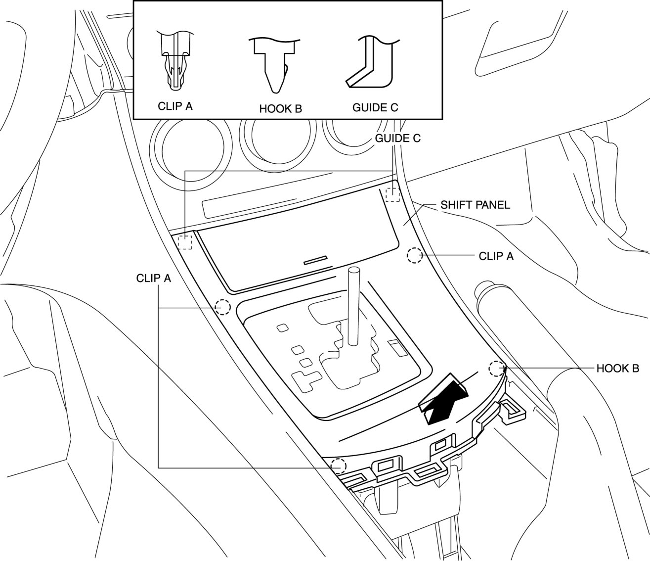 3. Pull the shift panel in the direction of the arrow shown in the figure and remove it while detaching the clips A, hook B and guides C.