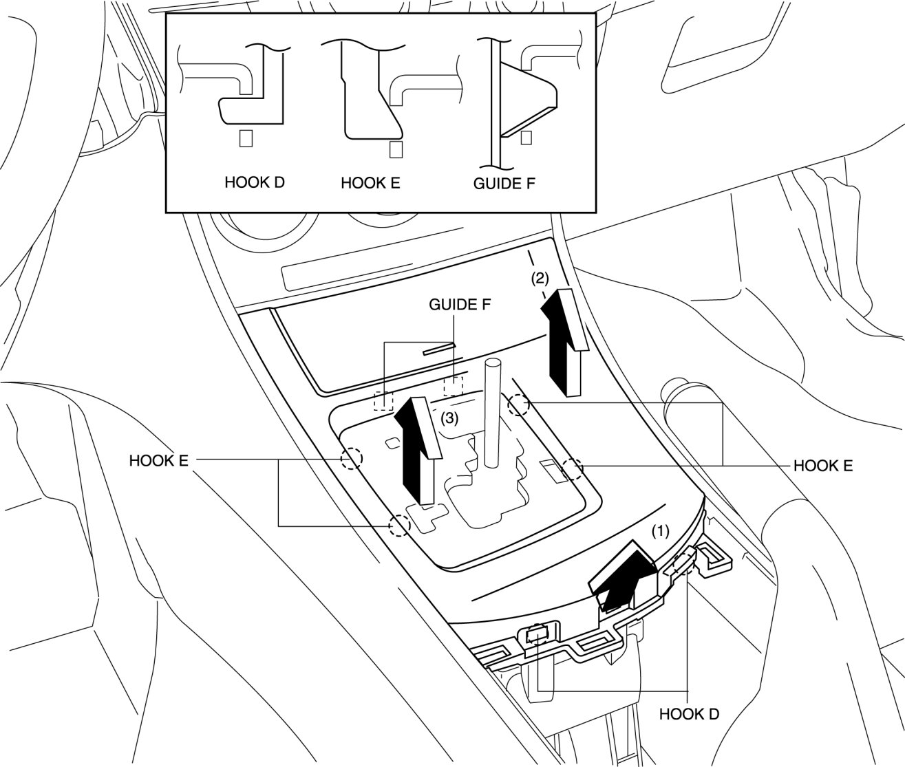 4. Pull the shift panel in the direction of the arrow (1), (2), (3) while remove the hooks D, E and guide F.