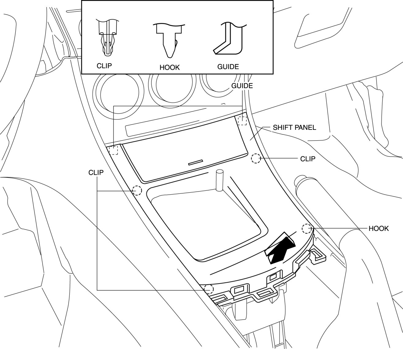 3. Pull the shift panel in the direction of the arrow shown in the figure and remove it while detaching the clips, hook and guides.