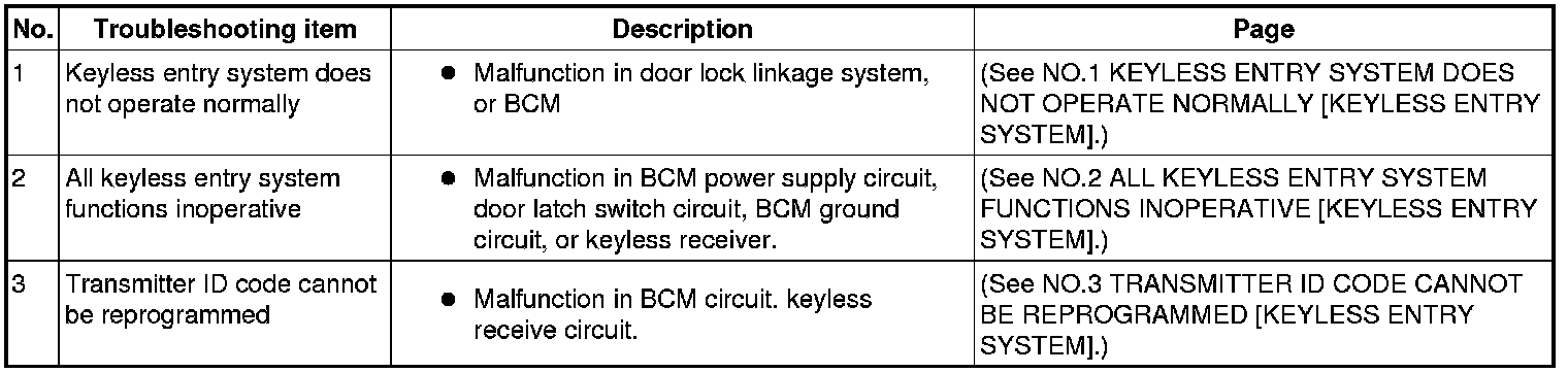 SYMPTOM TROUBLESHOOTING CHART [KEYLESS ENTRY SYSTEM]
