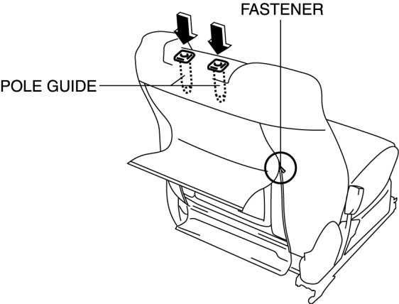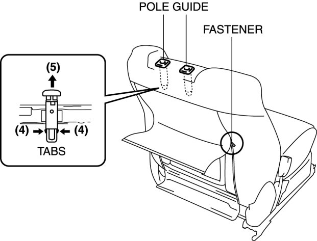 10. Partially peal back the front seat back trim, release the pole guide tabs in the direction of arrow (4) shown in the figure, then pull the pole guide out in the direction of arrow (5).