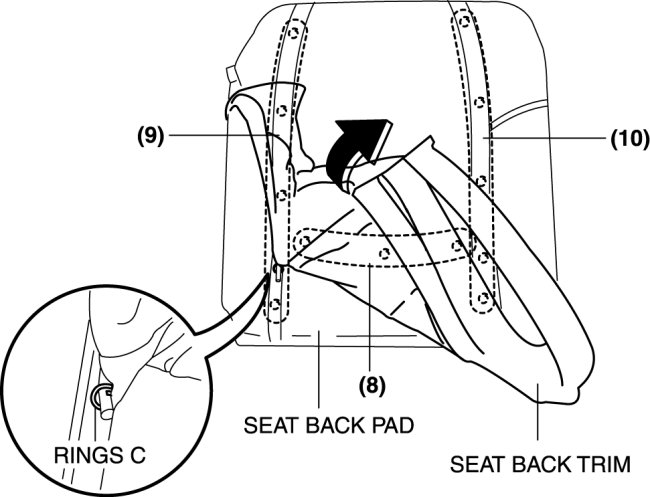 15. Partially peal back the seat back trim from the seat back pad, remove rings C in the order of (8), (9), (10) shown in the figure, then remove the seat back trim.