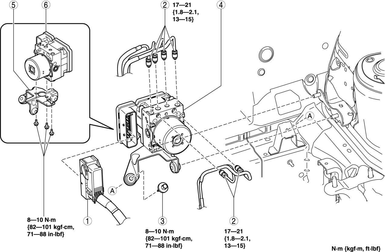 1. Align the marks made before removal and install the brake pipe into the DSC HU/CM referring to the figure.