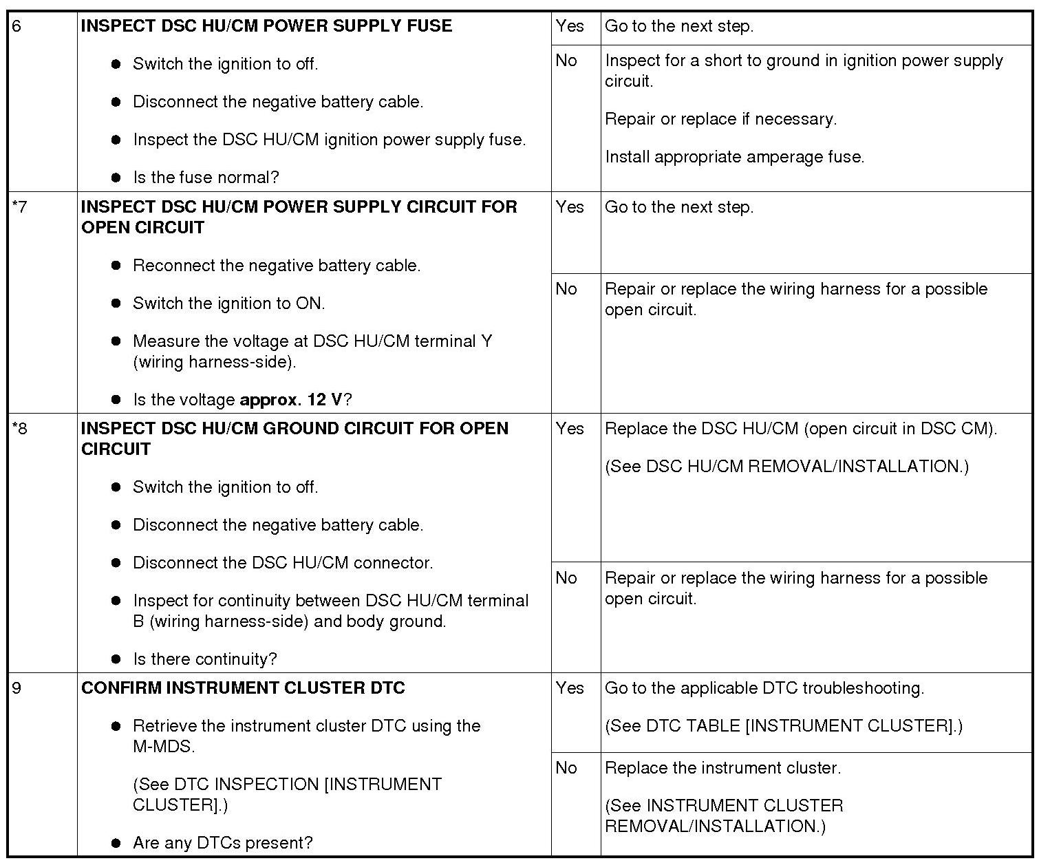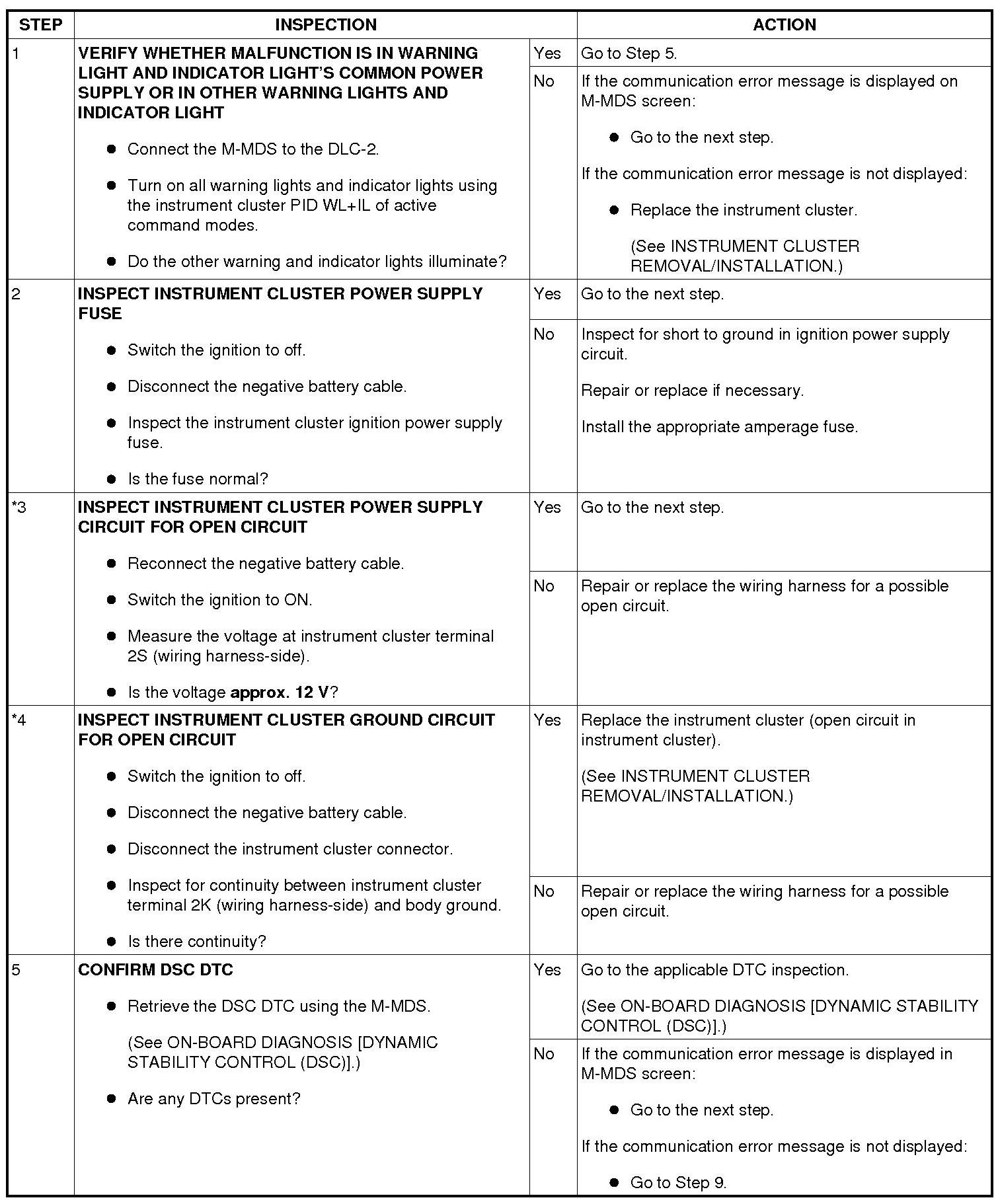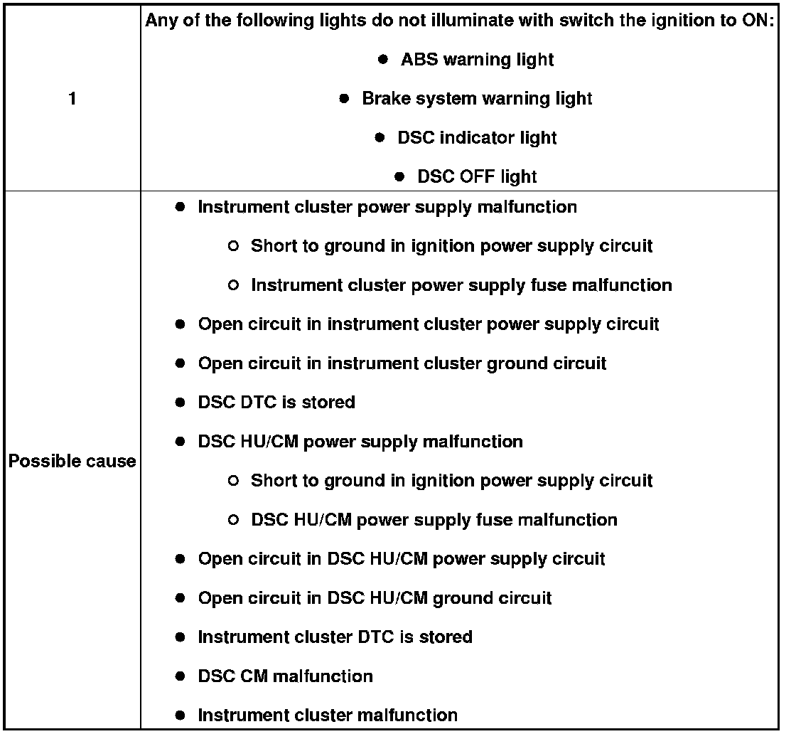 NO.1 ANY OF THE FOLLOWING LIGHTS DO NOT ILLUMINATE WITH SWITCH THE IGNITION TO ON: (ABS WARNING LIGHT, BRAKE SYSTEM WARNING LIGHT, DSC INDICATOR LIGHT AND/OR DSC OFF LIGHT) [DYNAMIC STABILITY CONTROL (DSC)]