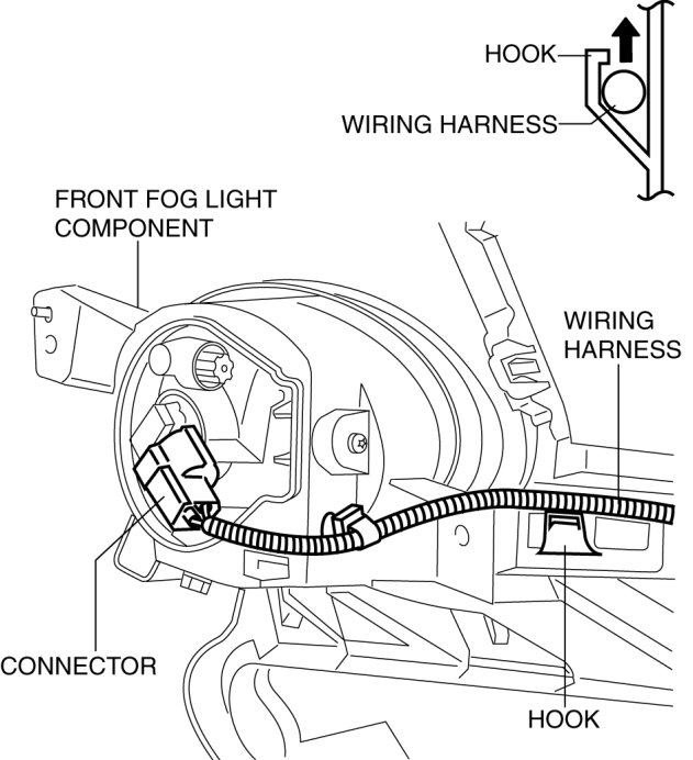 3. Pull the wiring harness from the hook in the direction of the arrow shown in the figure and remove it.