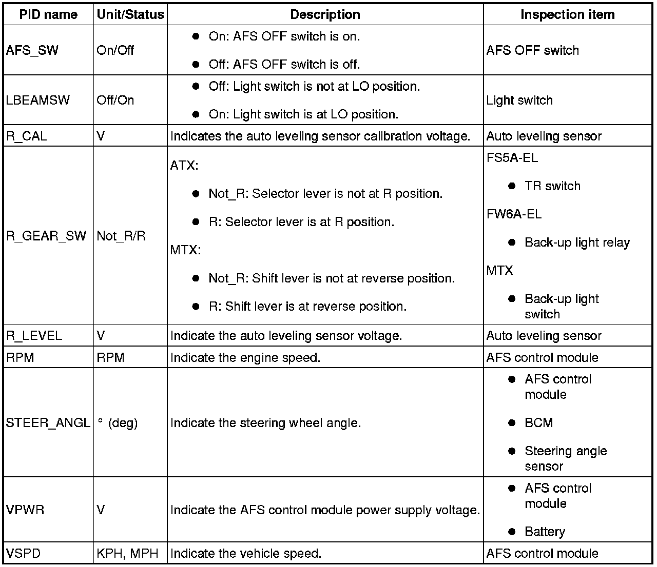 PID/DATA MONITOR TABLE [AFS (ADAPTIVE FRONT LIGHTING SYSTEM)]
