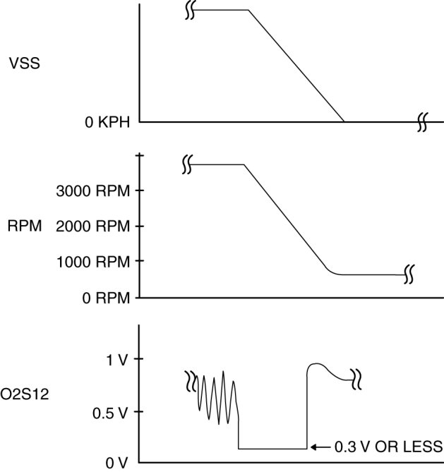 6. Verify that the HO2S outputs a voltage of 0.6 V or more, one time or more, then verify that the HO2S voltage (PID: O2S12) is 0.3 V or less while decelerating as shown in the figure.